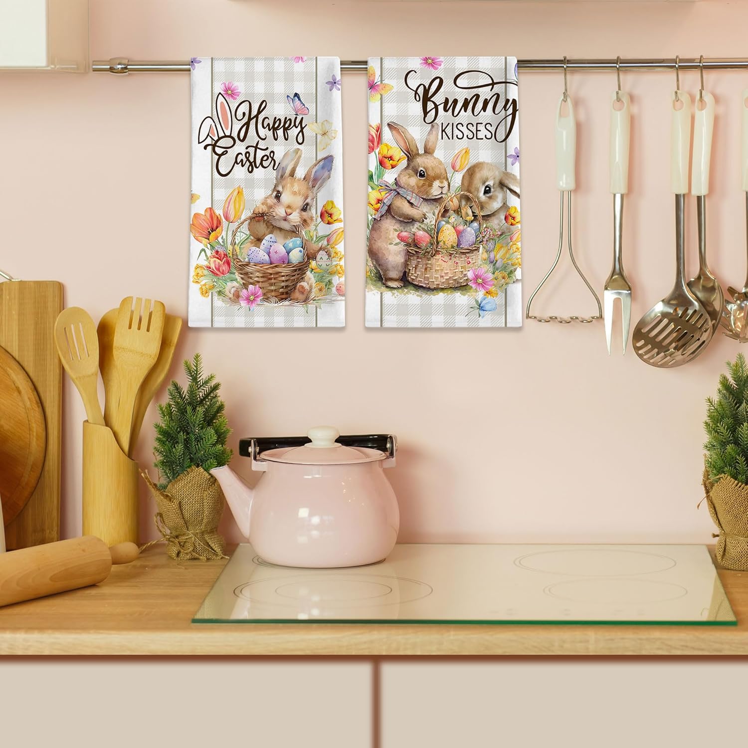 Easter Kitchen Towels Set of 2 – Bunny & Happy Easter Eggs (18×28 Inches)