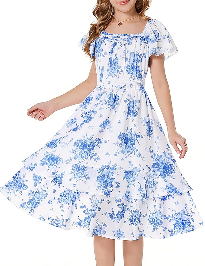 GRACE KARIN Girls Floral Summer Dress – Flutter Sleeve Square Neck Midi (6–14Y)