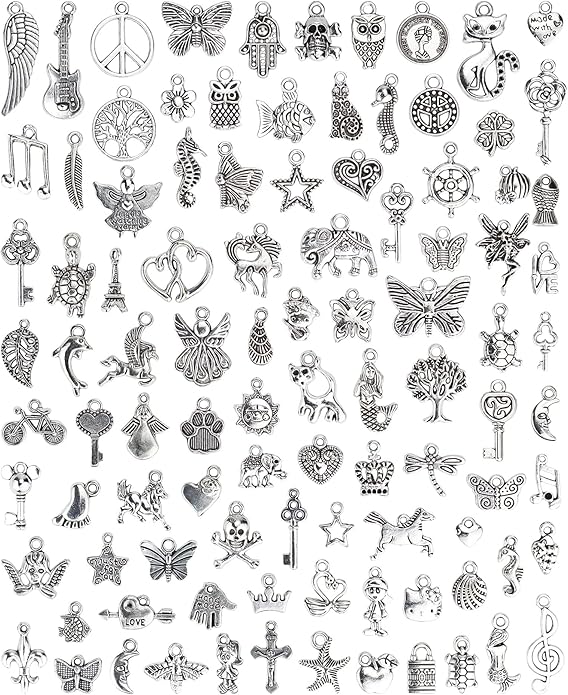 http:// The JIALEEY 100-piece charm set features mixed smooth Tibetan silver metal pendants designed for necklaces, bracelets, and DIY jewelry projects. With a timeless silver finish and versatile shapes, these charms are easy to pair with beads and chains. Ideal for beginners and experienced crafters creating handmade jewelry, gifts, and creative designs. Key Features: