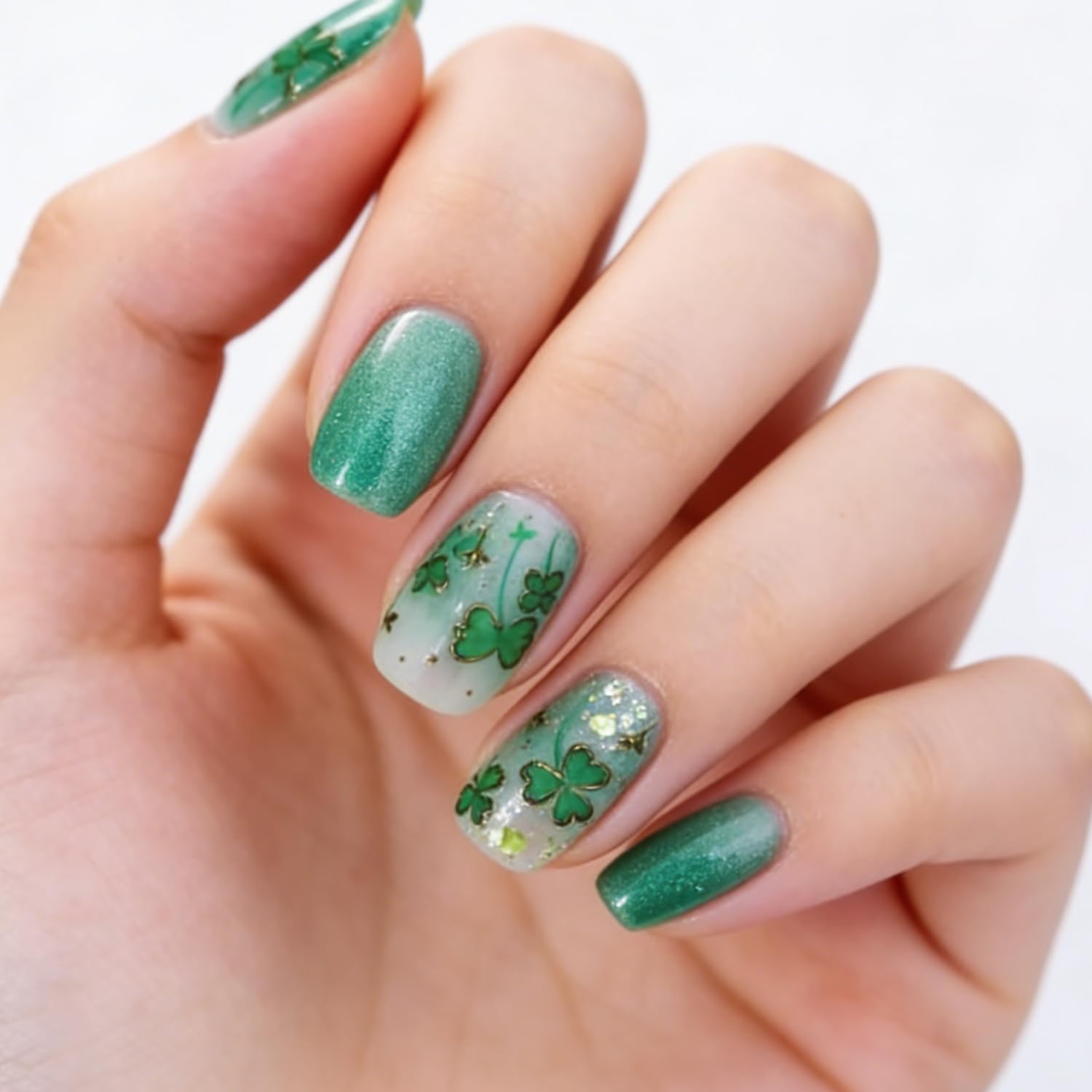 http:// Get lucky in style with these festive St. Patrick’s Day press-on nails. Featuring a sparkling green glitter gradient and adorable shamrock designs, this 24-piece short coffin set makes it easy to create a fun DIY manicure at home. A fun and festive nail set that delivers instant Irish charm—no salon appointment needed. 💚✨✨ Key Features