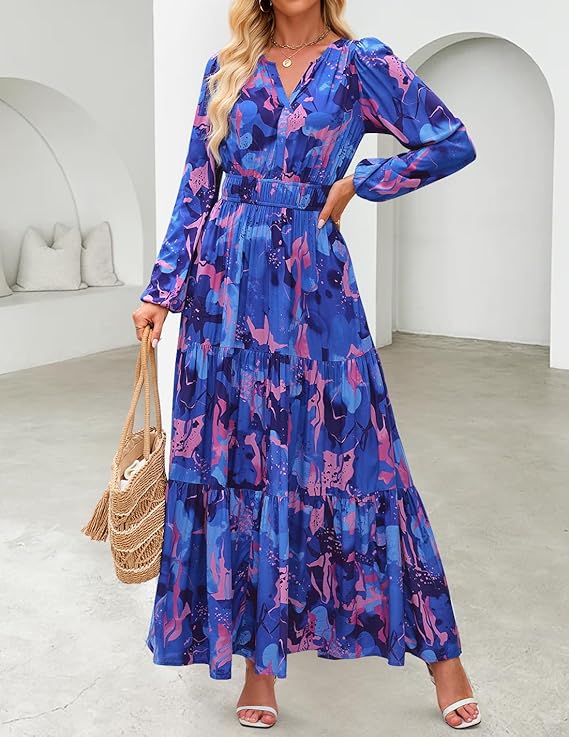ZESICA Women’s Boho Floral Maxi Dress – Long Sleeve V-Neck Empire Waist Dress 2026